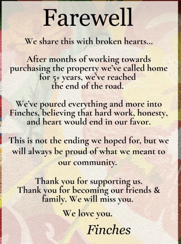 The ladies implied that they are in search of another space, but that is usually easier said than done. Finches was a locals favorite, for sure. Let’s hope we see them again.